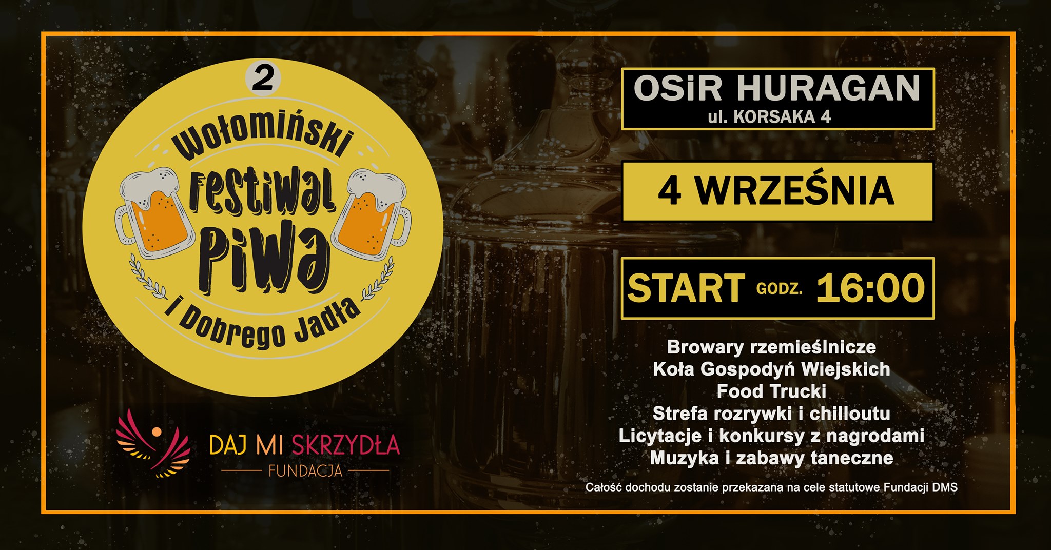 To będzie prawdopodobnie najlepsze wydarzenie tego roku w mieście. To już druga edycja Wołomińskiego Festiwalu Piwa i Dobrego Jadła. Jeszcze więcej regionalnych browarów rzemieślniczych i znakomitych potraw z Koła Gospodyń Wiejskich. Rożne smaki i rarytasy serwowane wprost z najlepszych polskich Food Trucków. Zabawy i konkursy dla dorosłych a także tańce przy gorących hitach! Dla spragnionych odpoczynku, strefa relaksu i chilloutu. A to wszystko już niebawem na terenie OSiR Huragan w Wołominie! Nie możecie przegapić takiej imprezy! Wszystkie środki zebrane podczas Festiwalu zostaną przekazane na cele statutowe wołomińskiej Fundacji Daj Mi Skrzydła. Nie wiem jak Wy, ale my nie możemy się już doczekać!